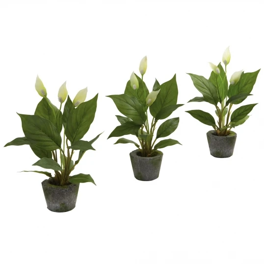 Beautiful plants always look better in sets of three, and that holds true with the Artificial Spathiphyllum plant. Each of these classic artificial houseplants is nestled in a simple concrete planter. The synthetic green leaves are accented with three cream colored blooms. Line them up, split them up, give them as gifts. No matter how you use them, you will love them.