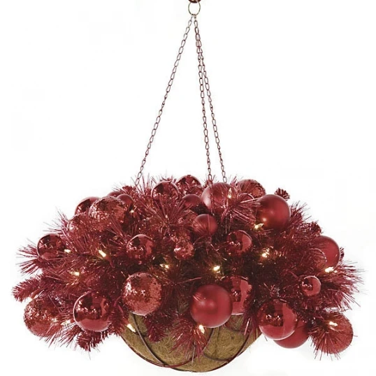 Elevate your holiday decor with the addition of the Red Tinsel Basket with Ornaments. This elegant hanging basket is filled with tinsel foliage and ornaments in a variety of finishes and clear 5MM LED lights for extra sparkle. This is ideal decor for a covered porch or kitchen space.