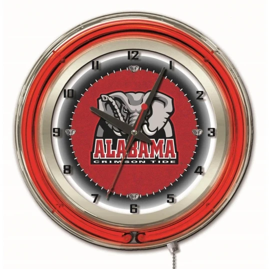 Our neon-accented Logo Clocks are the perfect way to show your school pride. Chrome casing and a team specific neon ring accent a custom printed clock face, lit up by an brilliant white, inner neon ring. Neon ring is easily turned on and off with a pull chain on the bottom of the clock, saving you the hassle of plugging it in and unplugging it. Accurate quartz movement is powered by a single, AA battery (not included). Whether purchasing as a gift for a recent grad, sports super fan, or for yourself, you can take satisfaction knowing you’re buying a clock that is proudly made by the Holland Bar Stool Company, Holland, MI.