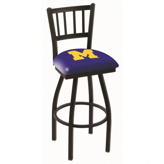 Made for the ultimate sports fan, impress your buddies with this knockout from Holland Bar Stool. This contemporary 25 inch Black Michigan Swivel Bar Stool has a jailhouse styled back that doesnt just add comfort, but sophistication. Holland Bar Stool uses a detailed screen print process that applies specially formulated epoxy-vinyl ink in numerous stages to produce a sharp, crisp, clear image of your desired logo. You can not find a higher quality logo stool on the market. The plating grade steel used to build the frame is commercial quality, so it will withstand the abuse of the rowdiest of friends for years to come. The structure is powder-coated black wrinkle to ensure a rich, sleek, long lasting finish. Construction of this framework is built tough, utilizing solid welds. If you are going to finish your bar or game room, do it right with a Holland Bar Stool.