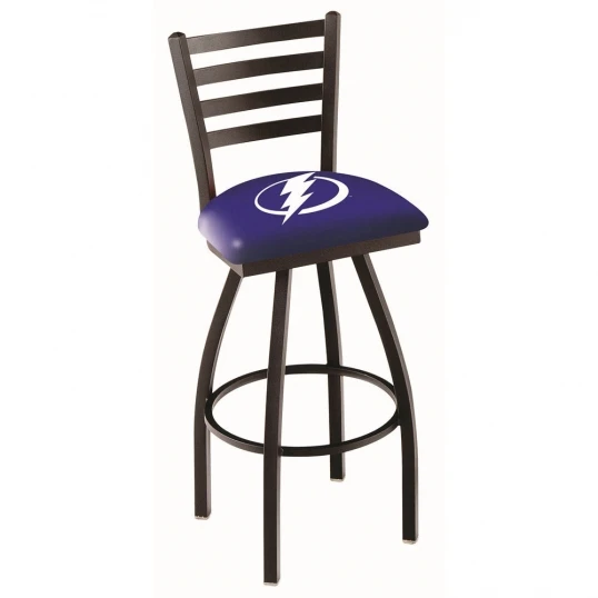 Made for the ultimate sports fan, impress your buddies with this knockout from Holland Bar Stool. This contemporary 25 inch Black Tampa Bay Lightning Swivel Bar Stool has a defined ladder style back that doesnt just add comfort, but sophistication. Holland Bar Stool uses a detailed screen print process that applies specially formulated epoxy-vinyl ink in numerous stages to produce a sharp, crisp, clear image of your desired logo. You can not find a higher quality logo stool on the market. The plating grade steel used to build the frame is commercial quality, so it will withstand the abuse of the rowdiest of friends for years to come. The structure is powder-coated black wrinkle to ensure a rich, sleek, long lasting finish. Construction of this framework is built tough, utilizing solid welds. If you are going to finish your bar or game room, do it right with a Holland Bar Stool.