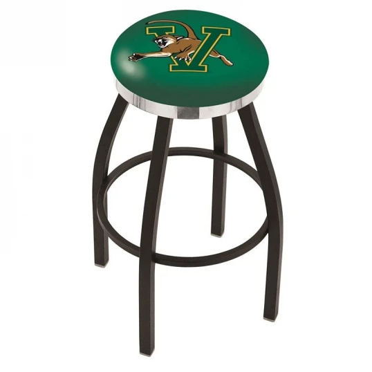 Made for the ultimate sports fan, impress your buddies with this knockout from Holland Bar Stool. This contemporary 25 inch Black Vermont Swivel Bar Stool with Chrome Accent Ring has a single-ring black wrinkle base with a 2.5 inch cushion and a chrome accent ring that helps the seat to pop-out at first glance. Holland Bar Stool uses a detailed screen print process that applies specially formulated epoxy-vinyl ink in numerous stages to produce a sharp, crisp, clear image of your desired logo. You can not find a higher quality logo stool on the market. The plating grade steel used to build the frame is commercial quality, so it will withstand the abuse of the rowdiest of friends for years to come. The structure is powder-coated to ensure a rich, sleek, long lasting finish. Construction of this framework is built tough, utilizing solid mig welds. If you are going to finish your bar or game room, do it right with a Holland Bar Stool.