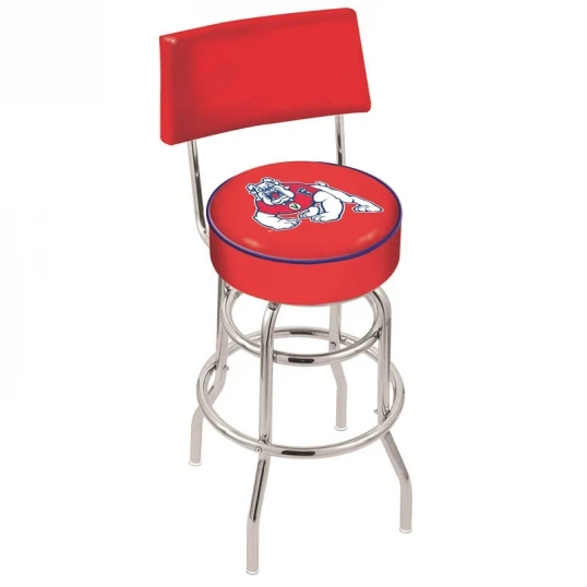 Made for the ultimate sports fan, impress your buddies with this knockout from Holland Bar Stool. This contemporary 25 inch Chrome 2-Ring Fresno State Swivel Bar Stool with Back has a 4 inch cushion with a tough double-ring base with a chrome finish and a cushioned back to achieve maximum comfort and support. Holland Bar Stool uses a detailed screen print process that applies specially formulated epoxy-vinyl ink in numerous stages to produce a sharp, crisp, clear image of your teams emblem. You can not find a higher quality logo stool on the market. The structure is triple chrome-plated to ensure a rich, polished finish that will last ages.