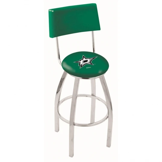 Made for the ultimate sports fan, impress your buddies with this knockout from Holland Bar Stool. This contemporary 25 inch Chrome Dallas Stars Swivel Bar Stool with Back has a chrome single-ring base and a cushioned back to achieve maximum comfort and support. Holland Bar Stool uses a detailed screen print process that applies specially formulated epoxy-vinyl ink in numerous stages to produce a sharp, crisp, clear image of your teams emblem. You can not find a higher quality logo stool on the market. The plating grade steel used to build the frame is commercial quality, so it will withstand the abuse of the rowdiest of friends for years to come. The structure is triple chromed to ensure a rich, sleek, long lasting finish. Construction of this framework is built tough, utilizing solid mig welds. If you are going to finish your bar or game room, do it right with a Holland Bar Stool.