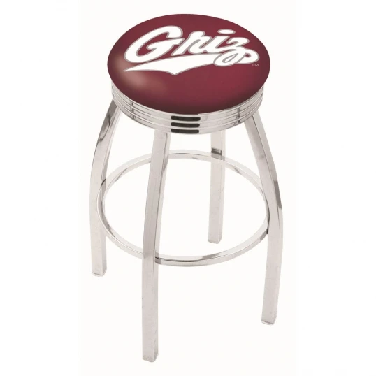 Made for the ultimate sports fan, impress your buddies with this knockout from Holland Bar Stool. This contemporary 25 inch Chrome Montana Swivel Bar Stool with Ribbed Accent has a single-ring chrome base with a 2.5 inch cushion and a 3 inch chrome ribbed accent ring that helps the seat to pop-out at first glance. Holland Bar Stool uses a detailed screen print process that applies specially formulated epoxy-vinyl ink in numerous stages to produce a sharp, crisp, clear image of your teams emblem. You can not find a higher quality logo stool on the market. The plating grade steel used to build the frame is commercial quality, so it will withstand the abuse of the rowdiest of friends for years to come. The structure is triple chromed to ensure a rich, sleek, long lasting finish. Construction of this framework is built tough, utilizing solid mig welds. If you are going to finish your bar or game room, do it right with a Holland Bar Stool.