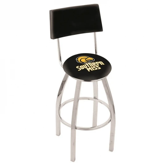 Made for the ultimate sports fan, impress your buddies with this knockout from Holland Bar Stool. This contemporary 25 inch Chrome Southern Miss Swivel Bar Stool with Back has a chrome single-ring base and a cushioned back to achieve maximum comfort and support. Holland Bar Stool uses a detailed screen print process that applies specially formulated epoxy-vinyl ink in numerous stages to produce a sharp, crisp, clear image of your teams emblem. You can not find a higher quality logo stool on the market. The plating grade steel used to build the frame is commercial quality, so it will withstand the abuse of the rowdiest of friends for years to come. The structure is triple chromed to ensure a rich, sleek, long lasting finish. Construction of this framework is built tough, utilizing solid mig welds. If you are going to finish your bar or game room, do it right with a Holland Bar Stool.
