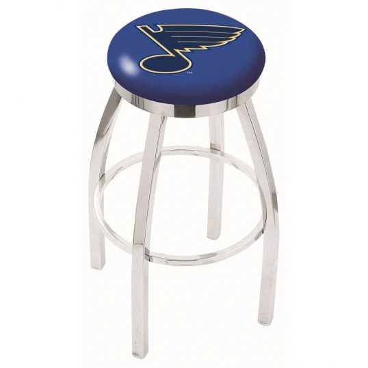 Made for the ultimate sports fan, impress your buddies with this knockout from Holland Bar Stool. This contemporary 25 inch Chrome St Louis Blues Swivel Bar Stool with Accent Ring has a single-ring chrome base with a 2.5 inch cushion and a chrome accent ring that helps the seat to pop-out at first glance. Holland Bar Stool uses a detailed screen print process that applies specially formulated epoxy-vinyl ink in numerous stages to produce a sharp, crisp, clear image of your desired logo. You can not find a higher quality logo stool on the market. The plating grade steel used to build the frame is commercial quality, so it will withstand the abuse of the rowdiest of friends for years to come. The structure is triple chrome plated to ensure a rich, sleek, long lasting finish. Construction of this framework is built tough, utilizing solid mig welds. If you are going to finish your bar or game room, do it right with a Holland Bar Stool.