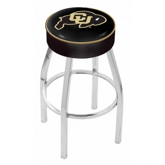Made for the ultimate sports fan, impress your buddies with this knockout from Holland Bar Stool. This contemporary 25 inch Colorado Logo Swivel Bar Stool with Chrome Base has a single-ring chrome base with a 4 inch cushion for a fashion that says sleek and simple. Holland Bar Stool uses a detailed screen print process that applies specially formulated epoxy-vinyl ink in numerous stages to produce a sharp, crisp, clear image of your desired logo. You can not find a higher quality logo stool on the market. The plating grade steel used to build the frame is commercial quality, so it will withstand the abuse of the rowdiest of friends for years to come. The structure is triple chrome plated to ensure a rich, deep finish that will last ages. Construction of this framework is built tough, utilizing only solid mig welds. If you are going to finish your bar or game room, do it right with a Holland Bar Stool.
