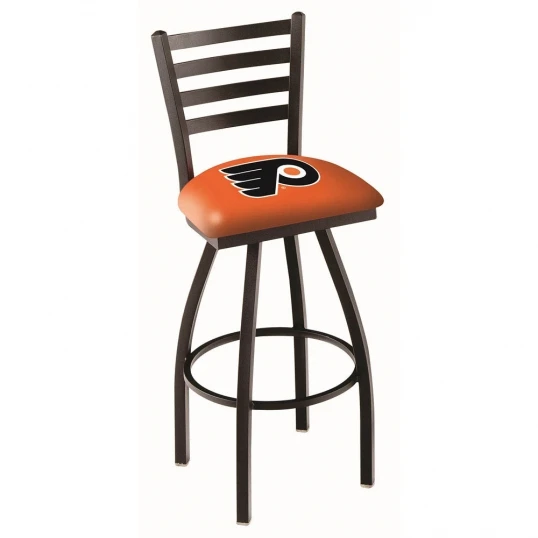 Made for the ultimate sports fan, impress your buddies with this knockout from Holland Bar Stool. This contemporary 25 inch Orange Philadelphia Flyers Ladder Back Swivel Bar Stool defined Ladder-style-Rack that doesnt just add comfort, but sophistication. Holland Bar Stool uses a detailed screen print process that applies specially formulated epoxy-vinyl ink in numerous stages to produce a sharp, crisp, clear image of your desired logo. You can not find a higher quality logo stool on the market. The plating grade steel used to build the frame is commercial quality, so it will withstand the abuse of the rowdiest of friends for years to come. The structure is powder-coated black wrinkle to ensure a rich, sleek, long lasting finish. Construction of this framework is built tough, utilizing solid welds. If you are going to finish your bar or game room, do it right with a Holland Bar Stool.