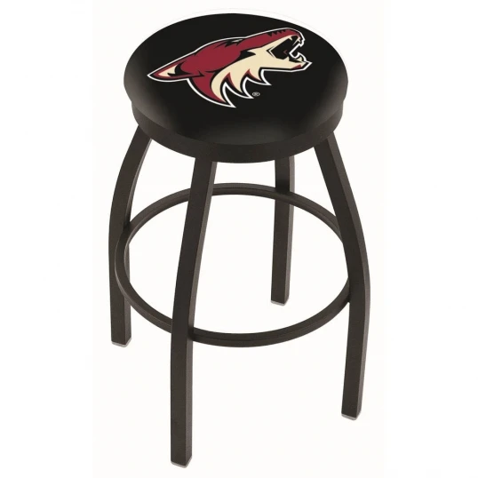 Made for the ultimate sports fan, impress your buddies with this knockout from Holland Bar Stool. This contemporary 30 inch Black Arizona Coyotes Swivel Counter Stool has a single-ring black wrinkle base with a 2.5 inch cushion and a black accent ring that helps the seat to pop-out at first glance. Holland Bar Stool uses a detailed screen print process that applies specially formulated epoxy-vinyl ink in numerous stages to produce a sharp, crisp, clear image of your desired logo. You can not find a higher quality logo stool on the market. The plating grade steel used to build the frame is commercial quality, so it will withstand the abuse of the rowdiest of friends for years to come. The structure is powder-coated to ensure a rich, sleek, long lasting finish. Construction of this framework is built tough, utilizing solid mig welds. If you are going to finish your bar or game room, do it right with a Holland Bar Stool.