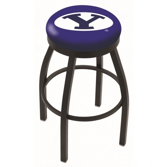 Made for the ultimate sports fan, impress your buddies with this knockout from Holland Bar Stool. This contemporary 30 inch Black Brigham Young Swivel Counter Stool has a single-ring black wrinkle base with a 2.5 inch cushion and a black accent ring that helps the seat to pop-out at first glance. Holland Bar Stool uses a detailed screen print process that applies specially formulated epoxy-vinyl ink in numerous stages to produce a sharp, crisp, clear image of your desired logo. You can not find a higher quality logo stool on the market. The plating grade steel used to build the frame is commercial quality, so it will withstand the abuse of the rowdiest of friends for years to come. The structure is powder-coated to ensure a rich, sleek, long lasting finish. Construction of this framework is built tough, utilizing solid mig welds. If you are going to finish your bar or game room, do it right with a Holland Bar Stool.