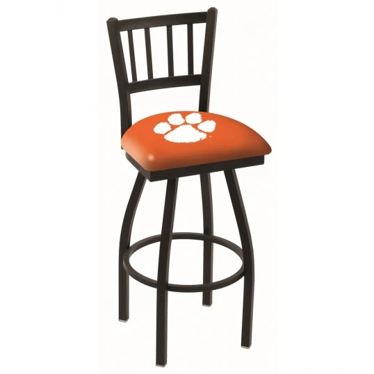 Made for the ultimate sports fan, impress your buddies with this knockout from Holland Bar Stool. This contemporary 30 inch Black Clemson Jailhouse Back Swivel Counter Stool has a defined Jailhouse back that doesnt just add comfort, but sophistication. Holland Bar Stool uses a detailed screen print process that applies specially formulated epoxy-vinyl ink in numerous stages to produce a sharp, crisp, clear image of your desired logo. You can not find a higher quality logo stool on the market. The plating grade steel used to build the frame is commercial quality, so it will withstand the abuse of the rowdiest of friends for years to come. The structure is powder-coated black wrinkle to ensure a rich, sleek, long lasting finish. Construction of this framework is built tough, utilizing solid welds. If you are going to finish your bar or game room, do it right with a Holland Bar Stool.