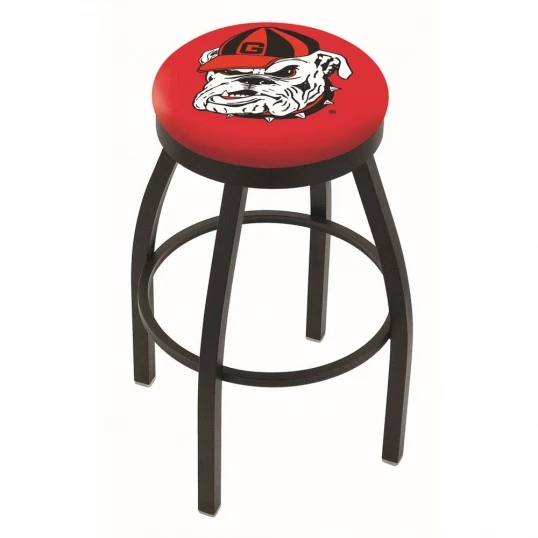 Made for the ultimate sports fan, impress your buddies with this knockout from Holland Bar Stool. This contemporary 30 inch Black Georgia Bulldog Swivel Counter Stool has a single-ring black wrinkle base with a 2.5 inch cushion and a black accent ring that helps the seat to pop-out at first glance. Holland Bar Stool uses a detailed screen print process that applies specially formulated epoxy-vinyl ink in numerous stages to produce a sharp, crisp, clear image of your desired logo. You can not find a higher quality logo stool on the market. The plating grade steel used to build the frame is commercial quality, so it will withstand the abuse of the rowdiest of friends for years to come. The structure is powder-coated to ensure a rich, sleek, long lasting finish. Construction of this framework is built tough, utilizing solid mig welds. If you are going to finish your bar or game room, do it right with a Holland Bar Stool.