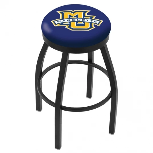 Made for the ultimate sports fan, impress your buddies with this knockout from Holland Bar Stool. This contemporary 30 inch Black Marquette Swivel Counter Stool has a single-ring black wrinkle base with a 2.5 inch cushion and a black accent ring that helps the seat to pop-out at first glance. Holland Bar Stool uses a detailed screen print process that applies specially formulated epoxy-vinyl ink in numerous stages to produce a sharp, crisp, clear image of your desired logo. You can not find a higher quality logo stool on the market. The plating grade steel used to build the frame is commercial quality, so it will withstand the abuse of the rowdiest of friends for years to come. The structure is powder-coated to ensure a rich, sleek, long lasting finish. Construction of this framework is built tough, utilizing solid mig welds. If you are going to finish your bar or game room, do it right with a Holland Bar Stool.