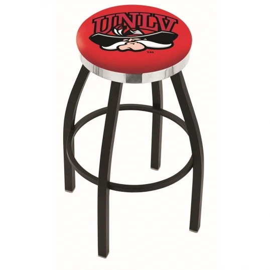 Made for the ultimate sports fan, impress your buddies with this knockout from Holland Bar Stool. This contemporary 30 inch Black UNLV Swivel Counter Stool with Chrome Accent Ring has a single-ring black wrinkle base with a 2.5 inch cushion and a chrome accent ring that helps the seat to pop-out at first glance. Holland Bar Stool uses a detailed screen print process that applies specially formulated epoxy-vinyl ink in numerous stages to produce a sharp, crisp, clear image of your desired logo. You can not find a higher quality logo stool on the market. The plating grade steel used to build the frame is commercial quality, so it will withstand the abuse of the rowdiest of friends for years to come. The structure is powder-coated to ensure a rich, sleek, long lasting finish. Construction of this framework is built tough, utilizing solid mig welds. If you are going to finish your bar or game room, do it right with a Holland Bar Stool.