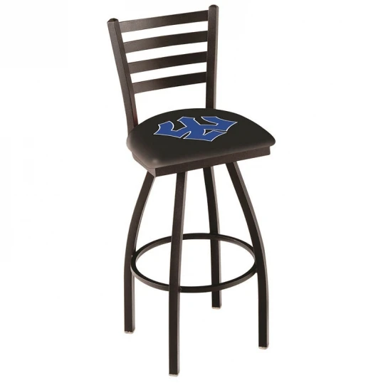Made for the ultimate sports fan, impress your buddies with this knockout from Holland Bar Stool. This contemporary 30 inch Black Washington & Lee Ladder Back Swivel Counter Stool defined ladder style back that doesnt just add comfort, but sophistication. Holland Bar Stool uses a detailed screen print process that applies specially formulated epoxy-vinyl ink in numerous stages to produce a sharp, crisp, clear image of your desired logo. You can not find a higher quality logo stool on the market. The plating grade steel used to build the frame is commercial quality, so it will withstand the abuse of the rowdiest of friends for years to come. The structure is powder-coated black wrinkle to ensure a rich, sleek, long lasting finish. Construction of this framework is built tough, utilizing solid welds. If you are going to finish your bar or game room, do it right with a Holland Bar Stool.