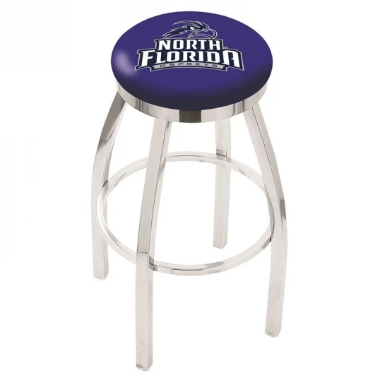 Made for the ultimate sports fan, impress your buddies with this knockout from Holland Bar Stool. This contemporary 30 inch Chrome North Florida Swivel Counter Stool with Accent Ring has a single-ring chrome base with a 2.5 inch cushion and a chrome accent ring that helps the seat to pop-out at first glance. Holland Bar Stool uses a detailed screen print process that applies specially formulated epoxy-vinyl ink in numerous stages to produce a sharp, crisp, clear image of your desired logo. You can not find a higher quality logo stool on the market. The plating grade steel used to build the frame is commercial quality, so it will withstand the abuse of the rowdiest of friends for years to come. The structure is triple chrome plated to ensure a rich, sleek, long lasting finish. Construction of this framework is built tough, utilizing solid mig welds. If you are going to finish your bar or game room, do it right with a Holland Bar Stool.
