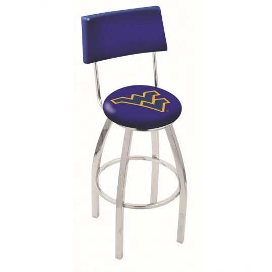 Made for the ultimate sports fan, impress your buddies with this knockout from Holland Bar Stool. This contemporary 30 inch Chrome West Virginia Swivel Counter Stool with Back has a chrome single-ring base and a cushioned back to achieve maximum comfort and support. Holland Bar Stool uses a detailed screen print process that applies specially formulated epoxy-vinyl ink in numerous stages to produce a sharp, crisp, clear image of your teams emblem. You can not find a higher quality logo stool on the market. The plating grade steel used to build the frame is commercial quality, so it will withstand the abuse of the rowdiest of friends for years to come. The structure is triple chromed to ensure a rich, sleek, long lasting finish. Construction of this framework is built tough, utilizing solid mig welds. If you are going to finish your bar or game room, do it right with a Holland Bar Stool.