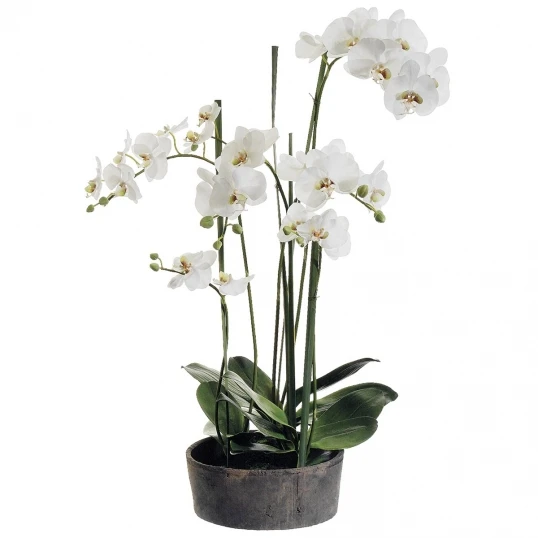 This centerpiece-worthy Phalaenopsis Orchid Plant in a Clay Pot is sophisticated, chic, and a beautiful addition to any decor. A round, rustic pot is the perfect neutral base to this tall plant. Multiple stems of polyester silk flowers and budge extend up from the simple base. This indoor arrangement is 18 inches wide and 37 inches tall.