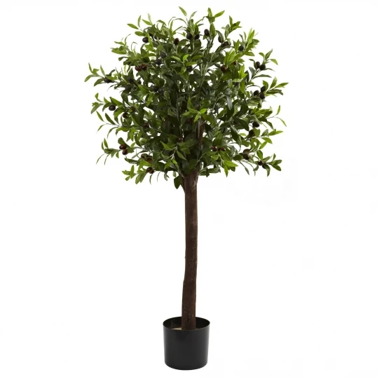 Potted plants don�t have to be boring, a fact that is proven with this gorgeous Artificial Olive Tree. This faux tree features a single dark brown trunk that is topped with a sphere of natural looking olive leaves and even olives themselves. Zoom in on this tree to see some of the amazing details in the leaves, trunk, and fruit.