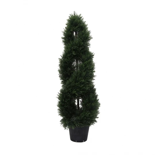 This 4 foot Cedar Double Spiral Topiary instantly adds sophisticated beauty to the front of your home or office entryway. The double spiral is unique and alluring to the eye. These UV protected topiaries are ideal for outside or on a sunny porch or patio.