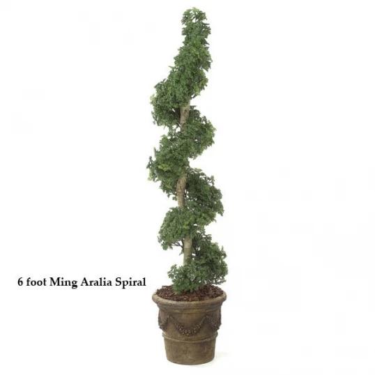 Artificial outdoor topiary will add a creative accent to the front entrance of your home or business. 6 foot outdoor Ming Aralia spiral topiary can be installed directly into the ground for a natural look or in a decorative planter. Our outdoor artificial topiary are infused with a UV inhibitor that is designed to protect against harmful UV rays, and they are designed to withstand average wind and rain exposure.