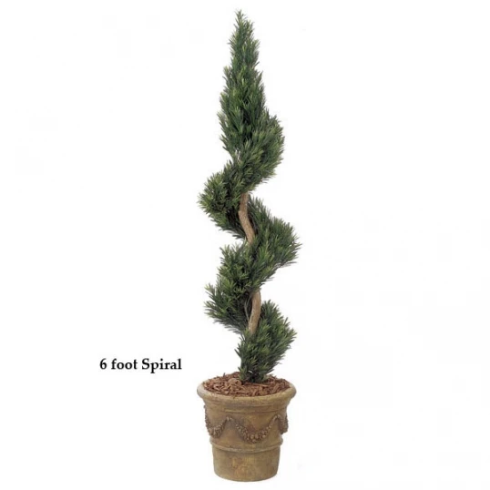 Artificial outdoor topiary will add a creative accent to the front entrance of your home or business. 6 foot outdoor Podocarpus spiral topiary can be installed directly into the ground for a natural look or in a decorative planter. Our outdoor artificial topiary are infused with a UV inhibitor that is designed to protect against harmful UV rays, and they are designed to withstand average wind and rain exposure.