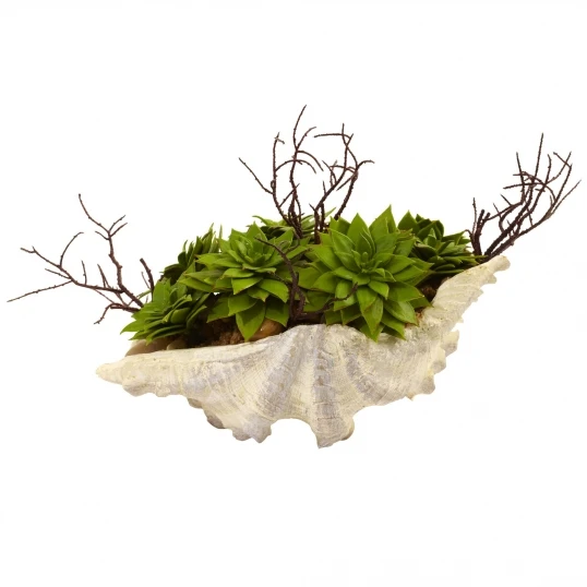 The days of Summer are back again when you add this remarkable piece to your collection! This succulent garden housed in a beautiful sea shell makes you feel like you are still enjoying that tropical holiday on the beach. Deep green succulents, twigs, sand and rocks all add unique detail to this extraordinary piece. This is a perfect gift to share with people who enjoy the reminders of those days and nights of warm waters and soft sands.