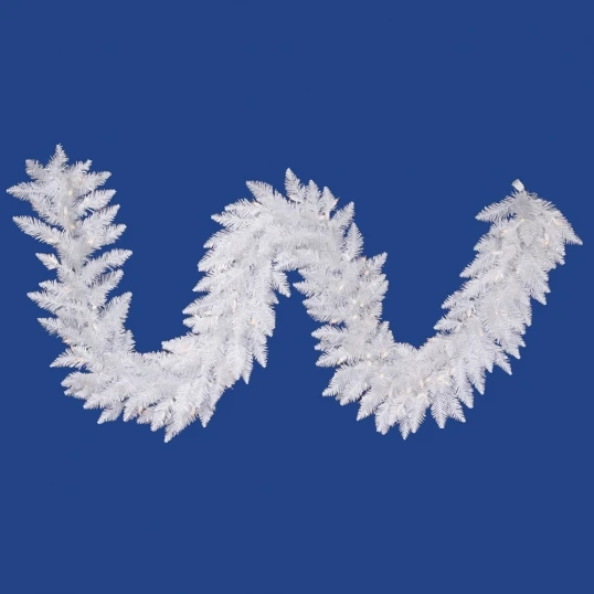 9 foot x 14 inch Sparkle White Garland 90 Clear LEDs. White may be the most striking, yet traditional, Christmas shade. It does not disappoint in the Sparkle White Spruce garland from Artificial Plants and Trees. Thick, dense PVC branches come together snugly in this elegant faux garland. Available unlit or pre-lit with clear, white, or multicolored lights. You don’t have to dream of a White Christmas anymore. It is here, with the Sparkle White Spruce garland!