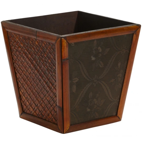In a set of four (to maximize your decorating potential) our set of two patterned planters is sure to delight. One side is decorated with a raised cross thatched design in a rich variety of dark burgundy and light browns; while its neighbor is finished with a light charcoal gray floral pattern on a darker background. Both patterns are framed with a beautiful wine colored bamboo finish.