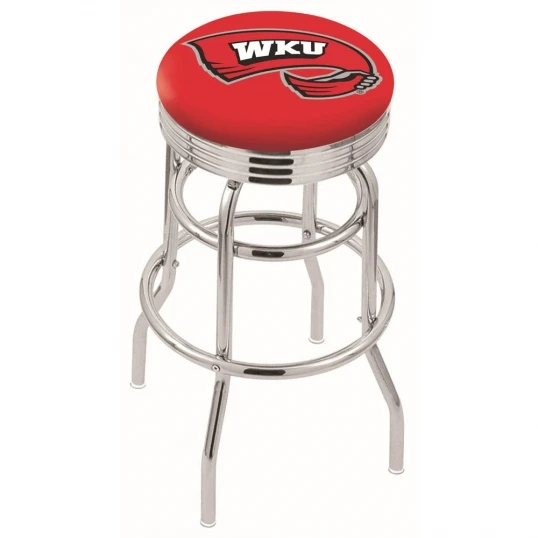 Made for the ultimate sports fan, impress your buddies with this knockout from Holland Bar Stool. This contemporary L7C3 – 30 inch Chrome 2-Ring Western Kentucky Swivel Counter Stool has a 2.5 inch cushion with a tough double-ring base with a chrome finish and a fashionable 3 inch ribbed chrome accent ring under the cushion to spice it up. Holland Bar Stool uses a detailed screen print process that applies specially formulated epoxy-vinyl ink in numerous stages to produce a sharp, crisp, clear image of your teams emblem. You can not find a higher quality logo stool on the market. The structure is triple chrome-plated to ensure a rich, polished finish that will last ages. If you are going to finish your bar or game room, do it right with a Holland Bar Stool.