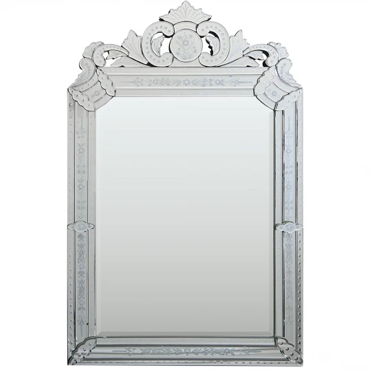 This elegant Venetian mirror features etched mirror, mirrored ornaments, and a marvelous crown! The large center mirror is beveled as are all the mirrored elements making up the border and crown.