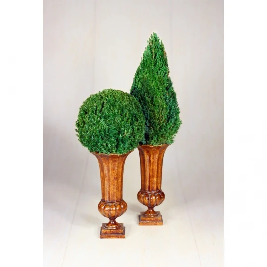 Decorate your home or office with a natural Mantle Juniper Cone Topiary. The unique preservation of this tree will enable it to maintain its natural feel, color and shape. This preserved tree is completely maintenance free, requiring no water, sunlight or soil. This topiary is potted in the decorative urn shown.