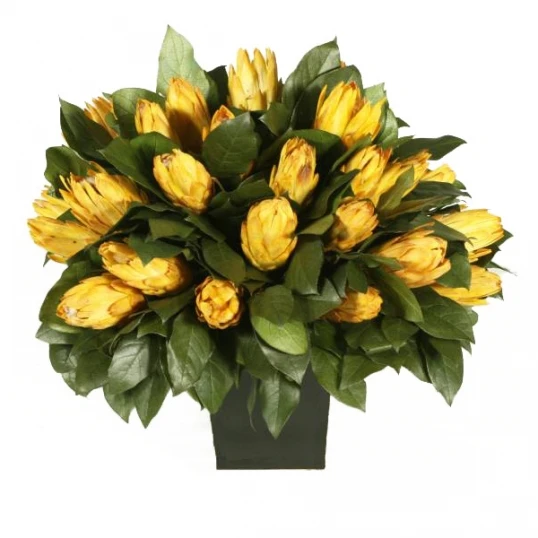 In this simple yet beautiful arrangement, we have arranged preserved protea flowers and lemon leaves in a black urn. You are able to choose the color of the Protea so this arrangement can fit the decor in any of your rooms! Item in picture is shown with Gold Protea. In this arrangement, the container and accents may differ slightly from what is pictured. If concerned, please contact customer service. We will be happy to let you know what containers and accents we are using today and send you pictures of the current items.