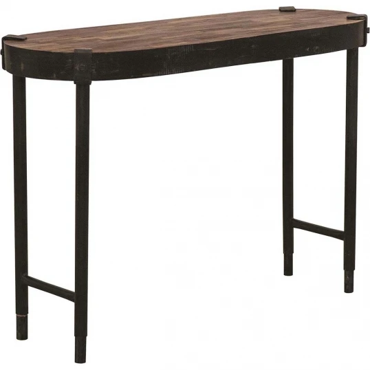 A weathered wood top and rusted metal finish combine to create this traditional console table rich in industrial details. The factory style is fully realized in the look of the butcher block top wrapped in metal and braced with decorative hardware. The masculine materials are softened by the feminine curve of the oval table top.